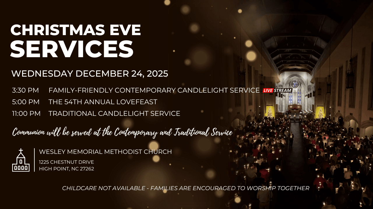 The Christmas Drive Thru Experience on Dec. 14th from 5pm-6:30pm is an audio narrated journey through the Christmas story. Every year 150+ vehicles visit our campus to drive through the experience, and it takes 30+ volunteers to accomplish this powerful evangelistic outreach to our community. Help set up or tear down! Be an angel, Mary, or Joseph! In addition to live animals with the nativity, this year we will also be adding a "Christmas Village" in the front circle so guests can connect with our church afterwards. This is a great service opportunity for entire Sunday school classes, small groups, families, children and youth. To sign up for your spot, visit wesleymemorial.org/drive (click the big red button to sign up) or call 336-884-2204. Let's make this our best year yet!